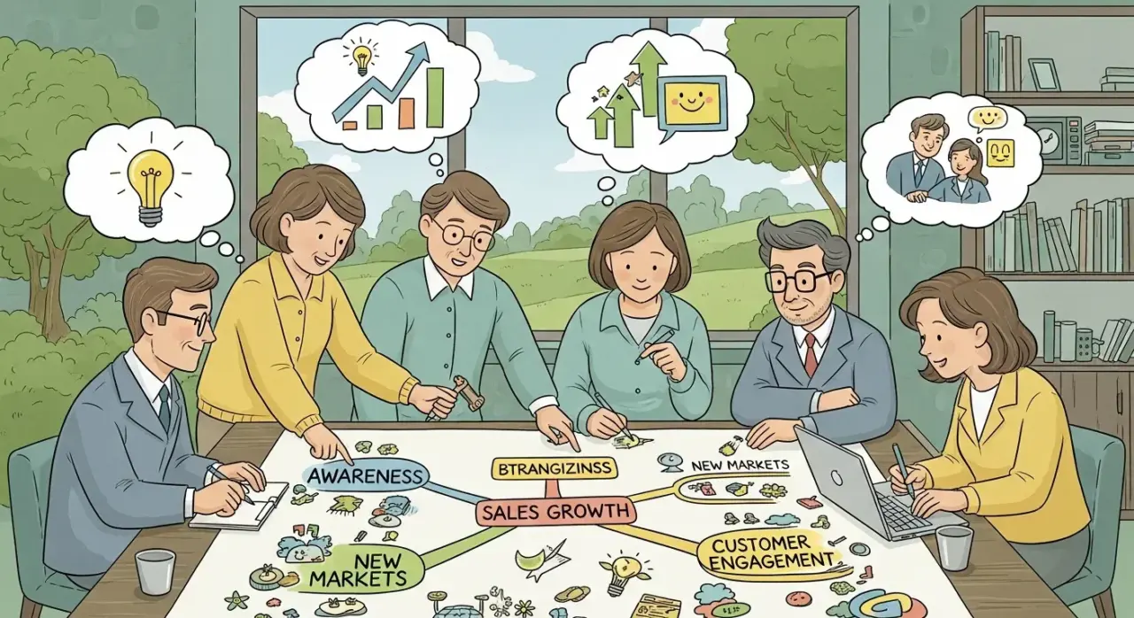 目的:「認知度を10%上げる」「資料請求を月50件獲得する」など、数値目標(KPI)を定めます。